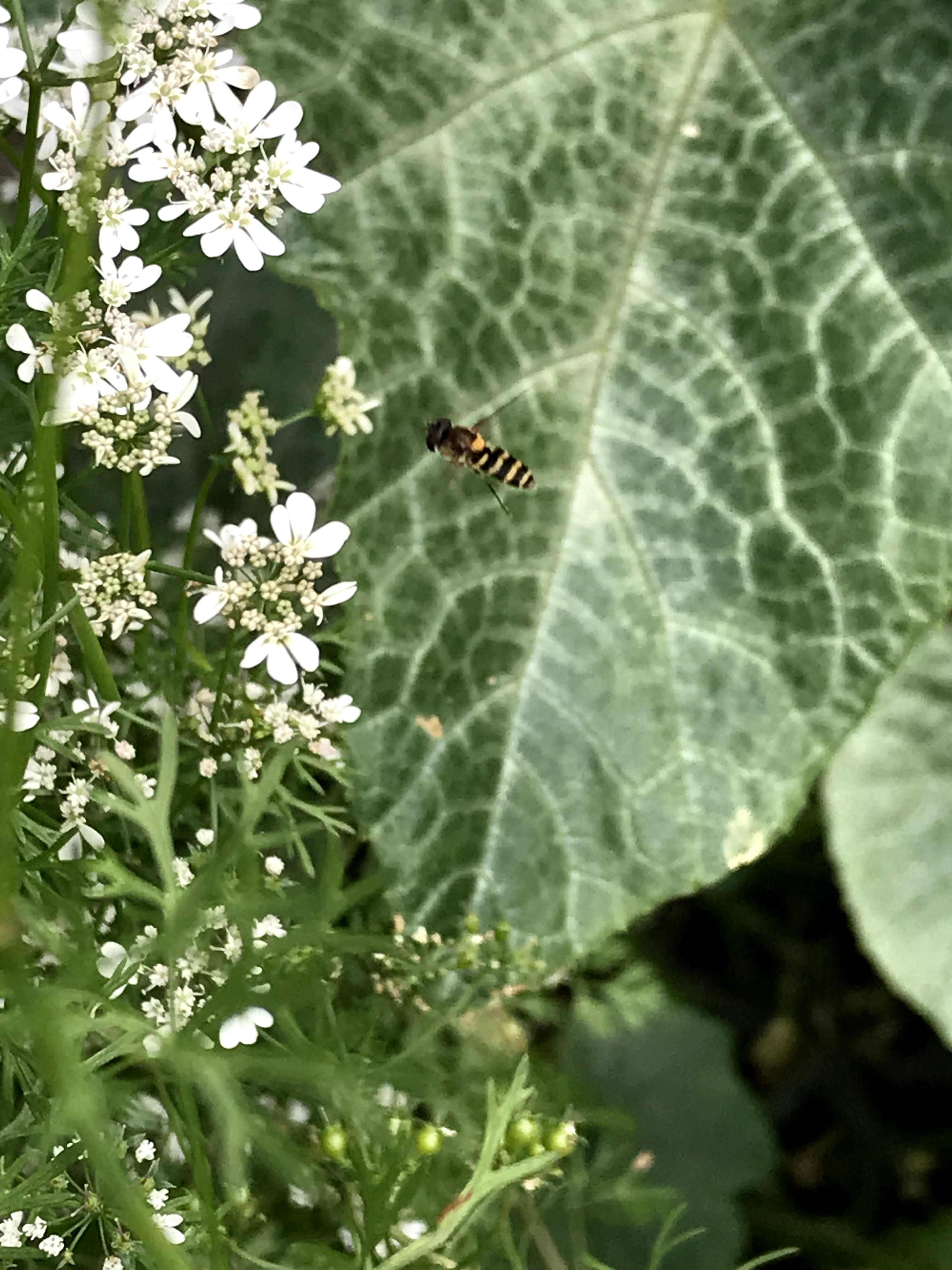 It’s gorgeous, the flowers are delicious, so you can eat it still PLUS it attracts fantastic insects - I'm going to keep harping on that, plant it even if you don't eat it. That's not a small wasp in the middle photo, it's a bad ass Hoverfly!