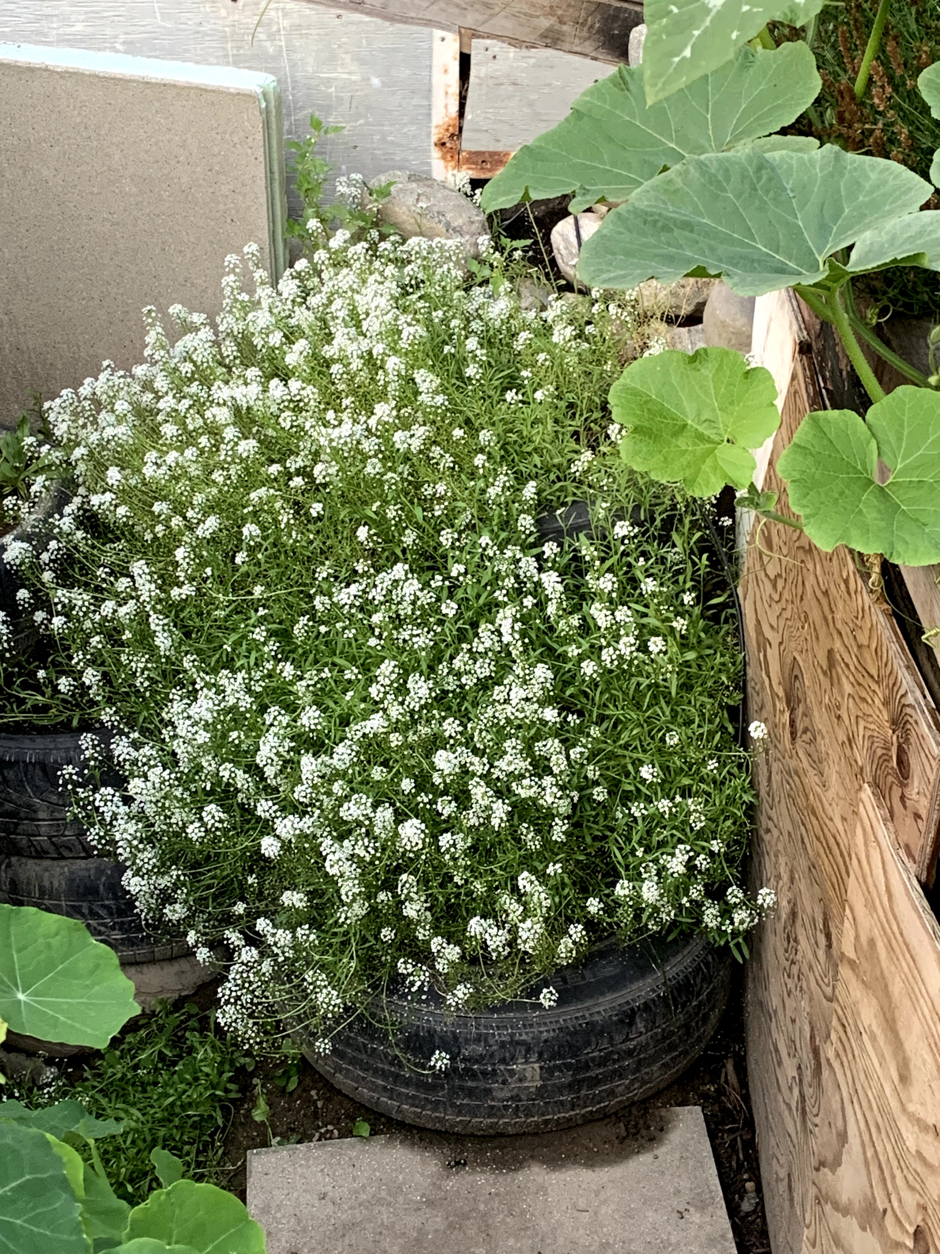 I am a square foot gardener, even in my large garden beds as it really minimizes weeding & I get more production of course!. Here's some photos of last years Alyssum and how I have planted one greenhouse bed, done Feb 12th. Once the plants are 3-4" tall I'll be sprinkling Alyssum everywhere to mulch and protect. I'm using my greenhouse to test a few new varieties before I get planting outdoors in April. The second photo is 3 tires tall, most of the tires are hidden by the Alyssum.
