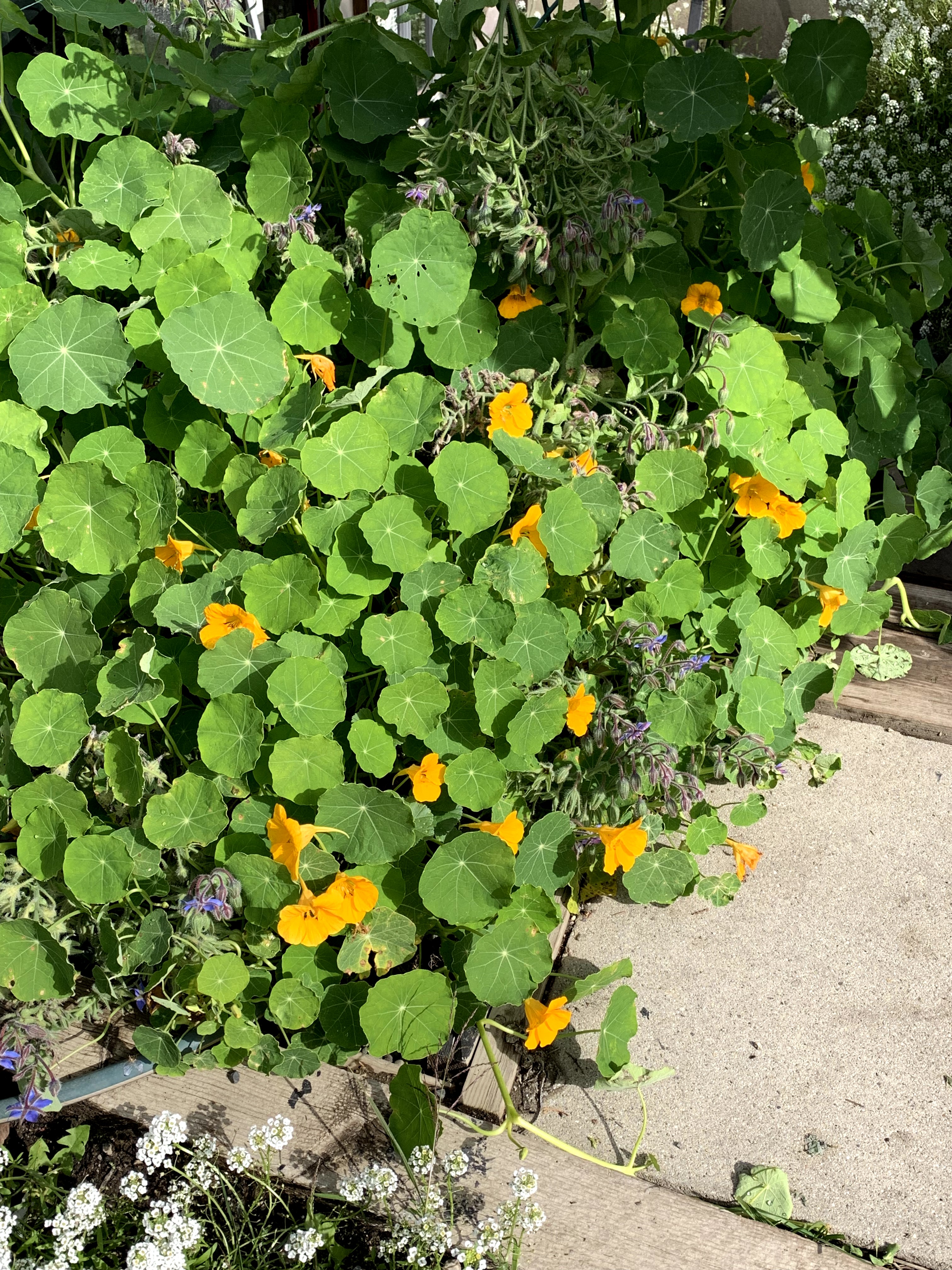 Nasturtium - Annual. Poke and go then allow to self seed. Vining or Clumping. Flowers and Leaves edible